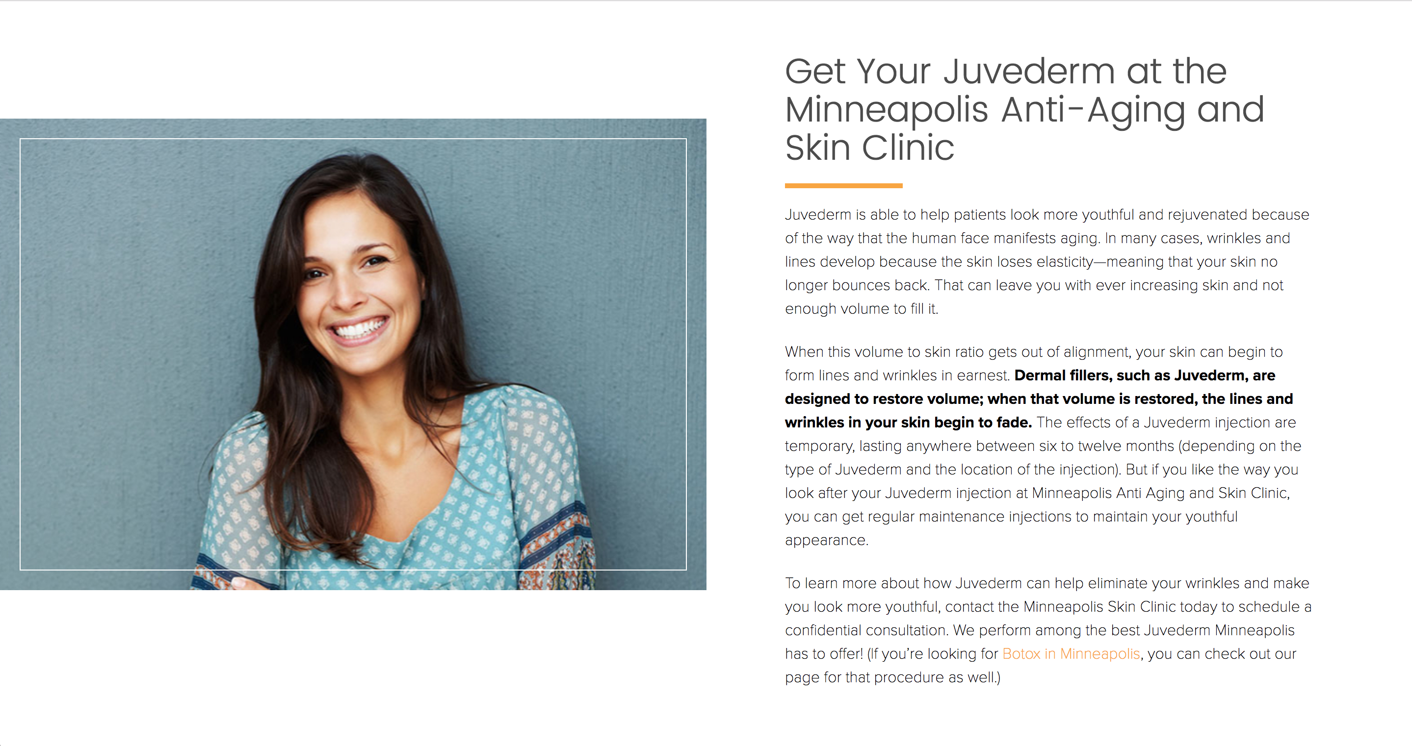 When NSE Media first began working with Minneapolis Anti-Aging and Skin Clinic, homepages were generally designed to be simple affairs. These days, content on homepages is a huge key to success. That’s why I composed the content on the homepage to succeed for both marketing and SEO purposes. The design team at NSE Media did an amazing job of helping that content to really pop in an evocative way!